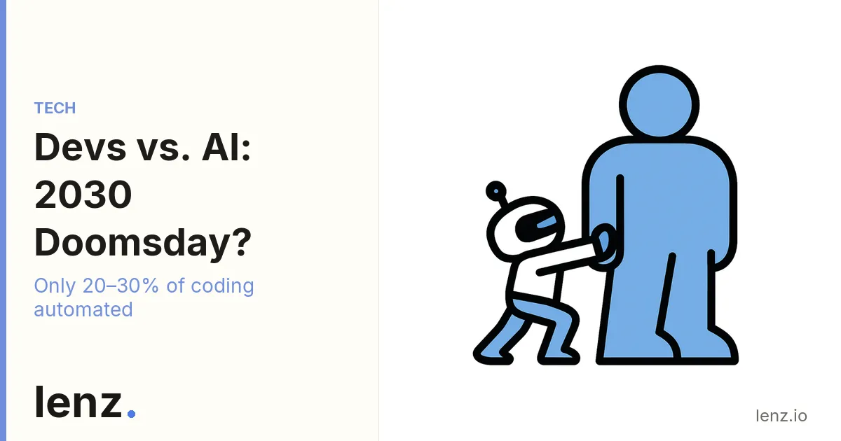 By 2030, AI is likely to absorb 20–30% of routine implementation work and replace junior software developers whose job is mostly small changes, boilerplate, and predictable tickets. The U.S. Bureau of Labor Statistics still projects software developer employment to grow by 17.9% by 2033.