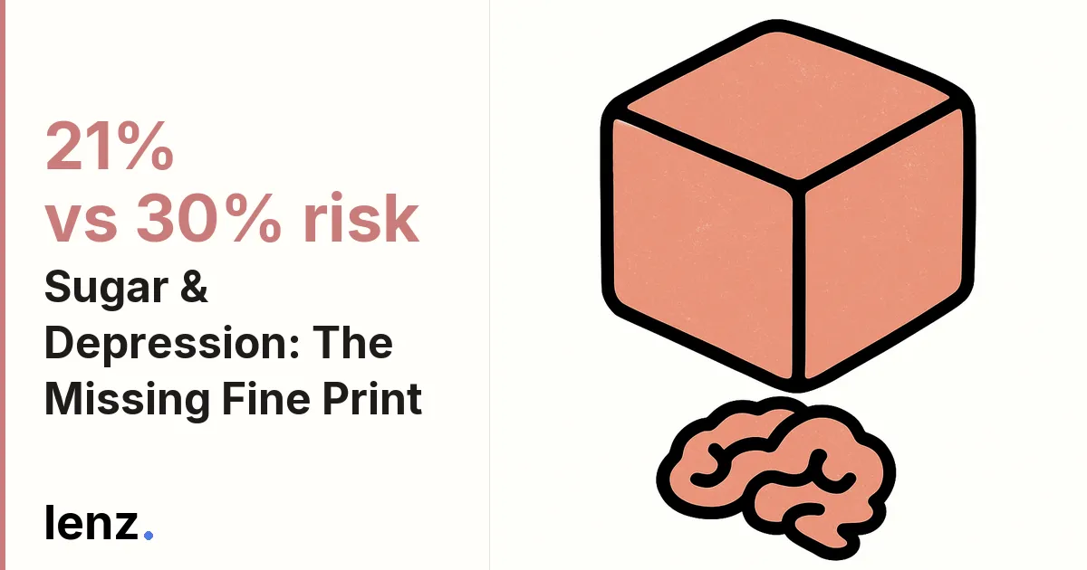 The specific claim of a "30% increased risk" is not supported by the best available evidence: the most comprehensive and recent meta-analyses (Sources 3, 6, 7, 8, and 14), encompassing over 1.2 million participants, consistently find only a 21% increased odds of depression, while Source 5 — a prospective cohort meta-analysis specifically designed to minimize reverse causation — found no statistically significant association at all (RR=1.08, 95% CI 0.95–1.22). Furthermore, the 31% figure cited in Source 2 applies narrowly to sugar-sweetened beverages, not "high sugar intake" broadly, and even Source 17 explicitly confirms that "no exact 30% figure is standard," exposing the claim's precise statistic as a misrepresentation of the actual scientific consensus.