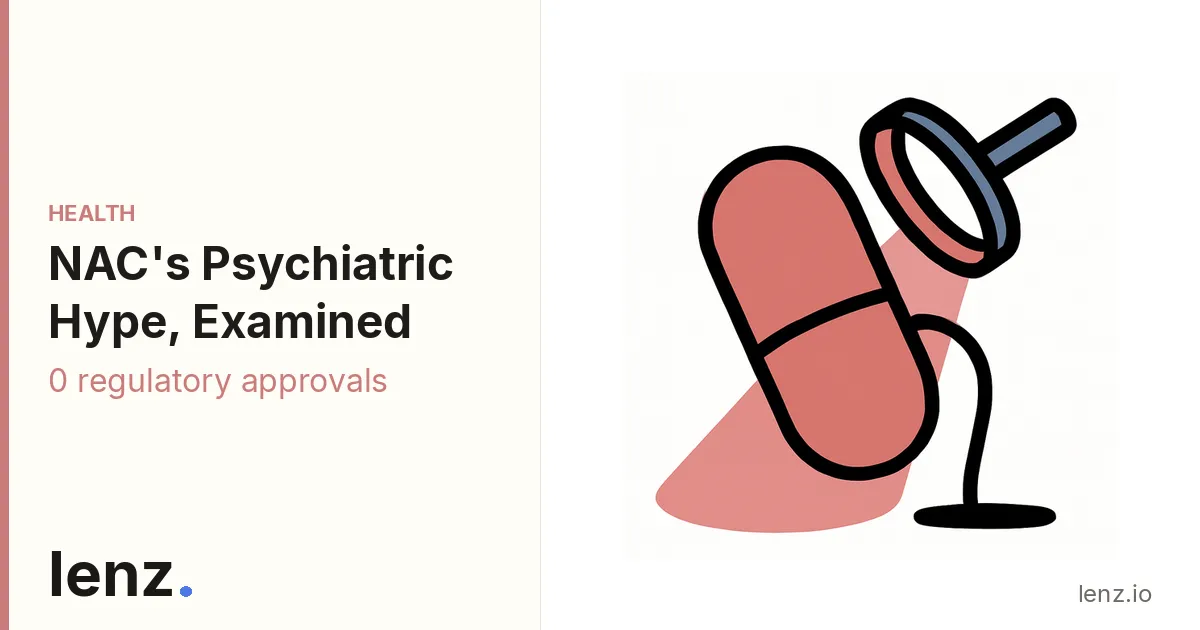 - No major regulatory authority (FDA, EMA, or WHO) has approved NAC for OCD, bipolar disorder, or schizophrenia as of April 2026, and some RCTs have found results statistically insignificant due to comparable placebo responses.