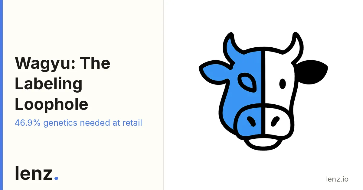 USDA allows beef with at least 46.9% Wagyu genetics to be labeled as Wagyu for retail sale, permitting crosses with other breeds like Angus. Restaurants face no such federal labeling requirements for menu items, leading to potential misuse of terms like 'Wagyu' or 'Kobe' without specifying origin or purity. This regulatory gap has prompted industry efforts like the American Wagyu Association's certification programs.